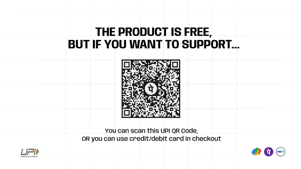 (It's completely free, but if you want to support you can pay by UPI (swipe the image above to get QR code) or using credit/debit card at checkout)